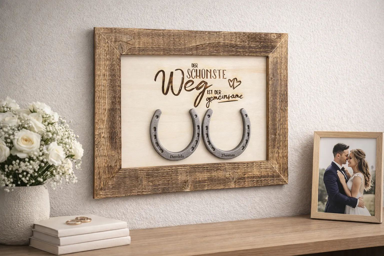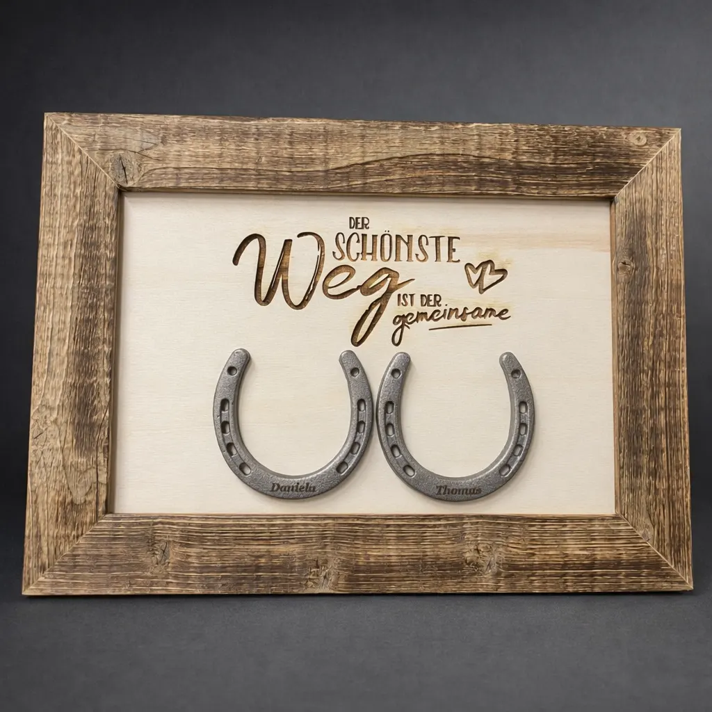 Dieses personalisierte Wandbild mit Hufeisen ist das perfekte Geschenk für Paare, die ihren gemeinsamen Lebensweg feiern möchten.