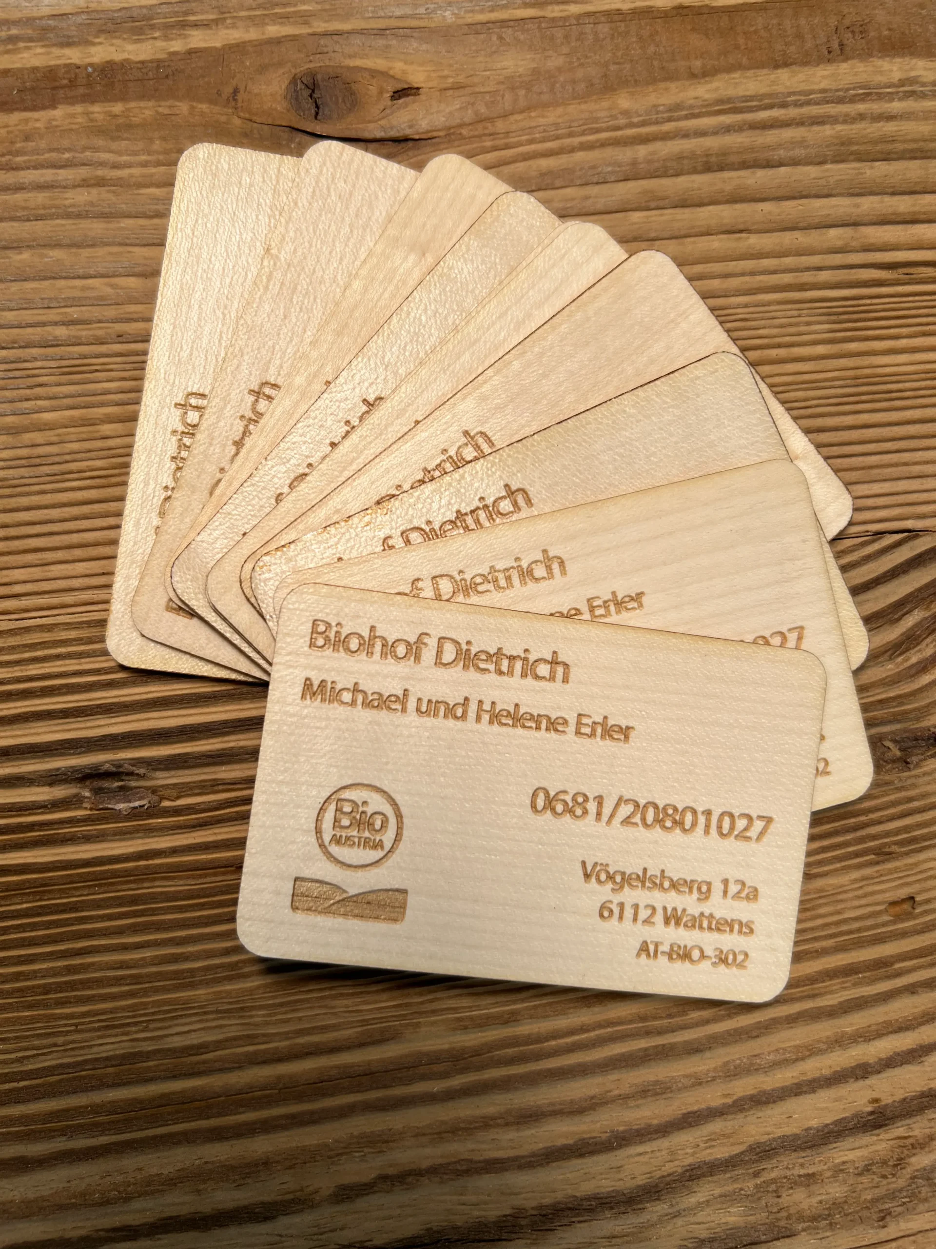 🌳 100% natürliches Material: Unsere Visitenkarten werden aus hochwertigem, regionalem Holz gefertigt. Unterstützen Sie die lokale Wirtschaft und schonen Sie die Umwelt!