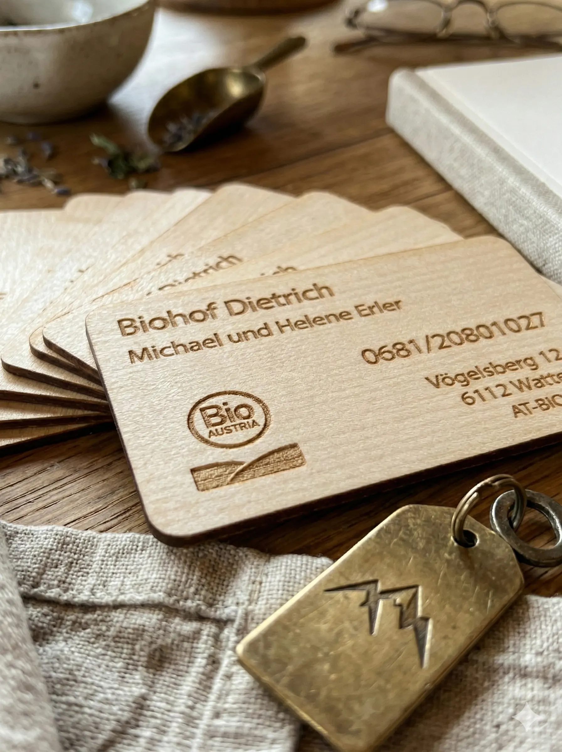 Entdecket unsere exklusiven Holzvisitenkarten – Meisterhaft graviert und präzise geschnitten für einen bleibenden Eindruck!
