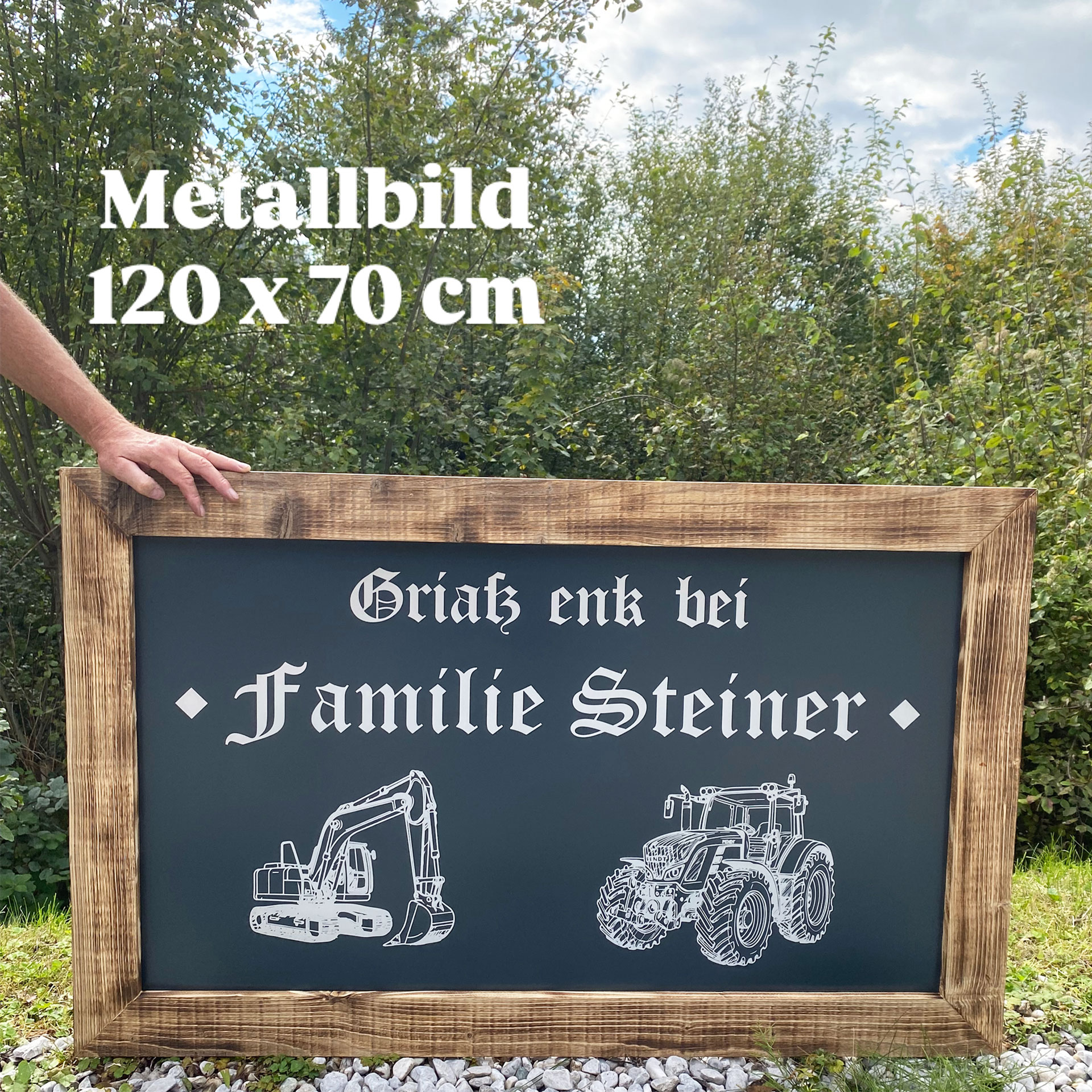 Verleihe deinem Zuhause, deinem Geschäft oder deinem Lieblingsplatz einen ganz besonderen Charakter – mit einer individuell gefertigten Metallbeschriftung im rustikalen Altholzrahmen.