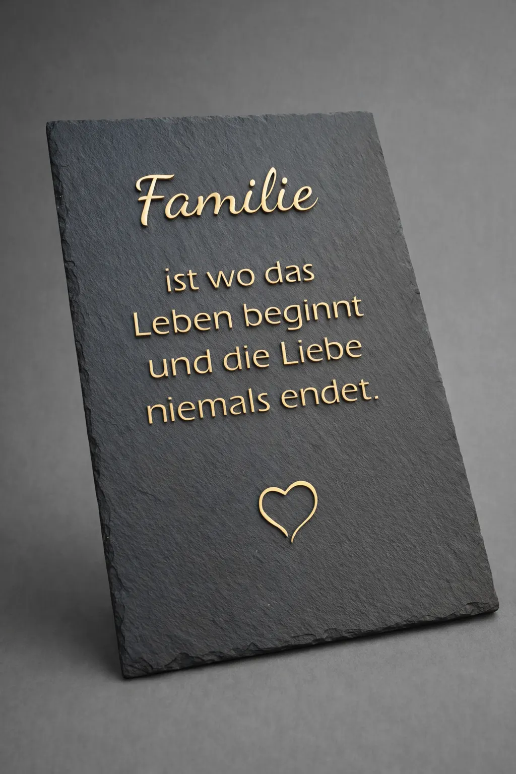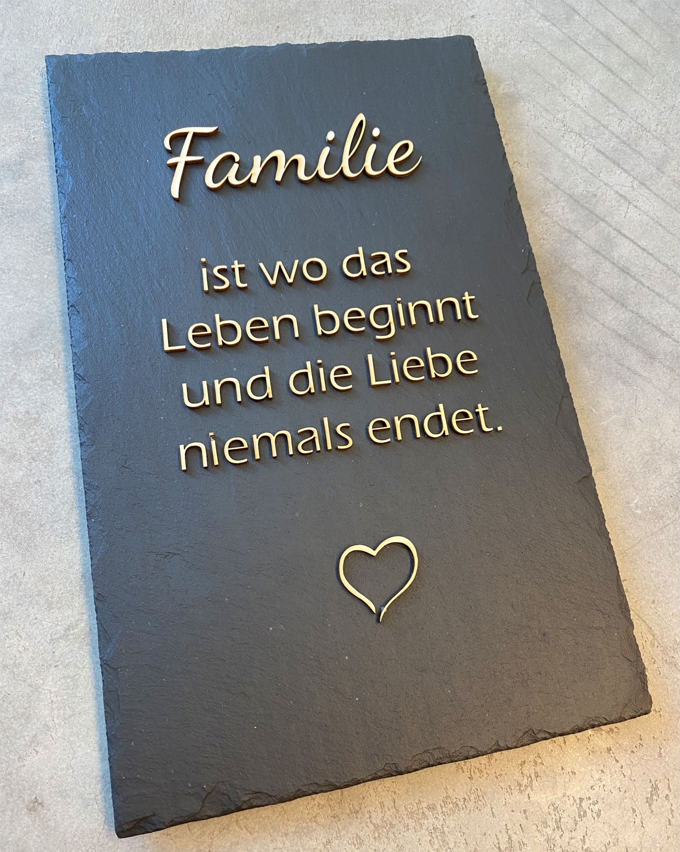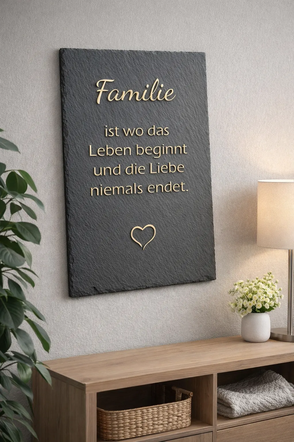 Unsere edle Schieferplatte mit Holzspruch vereint natürliche Materialien und moderne Lasertechnik zu einem besonderen Blickfang.